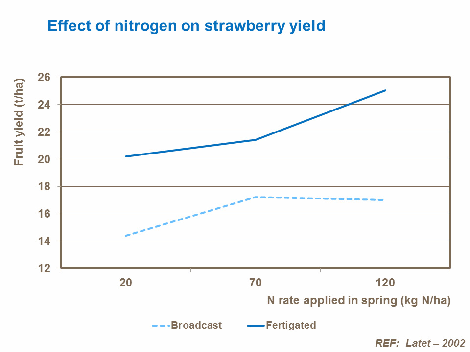 Pri uzgoju jagoda u sistemima intenzivne kultivacije tla - gde se po pravilu koriste laganija tla, podložna ispiranju, a biljke imaju i pliće korene nego u drugim uslovima – preporučuje se primena azota u više navrata. Pritom, iskorišćenost azota biće veća ako ga primenite fertirigacijom, a ne rasipanjem đubriva.