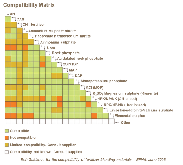 Proizvode koji nisu kompatibilni nemojte skladištiti jedne blizu drugima - na primer, urea ne sme biti u blizini azotnih đubriva; držite ih na što je moguće većoj udaljenosti. Nikada ne mešajte đubriva koja prethodno nisu bila adekvatno uskladištena. Držite kreč i đubrivo na što većoj međusobnoj udaljenosti. (Konsultujte matricu kompatibilnosti ispod te fizička svojstva đubriva)