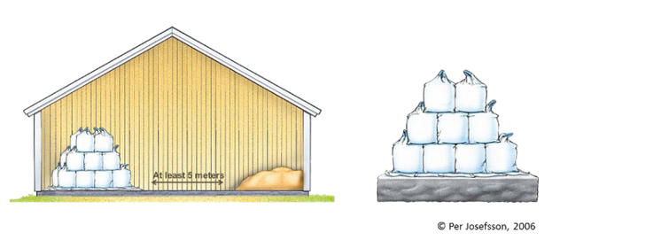 Skladištite na udaljenosti najmanje 1 metar od streha i greda, a ako su đubriva u vrećama i najmanje 1 metar od zidova.